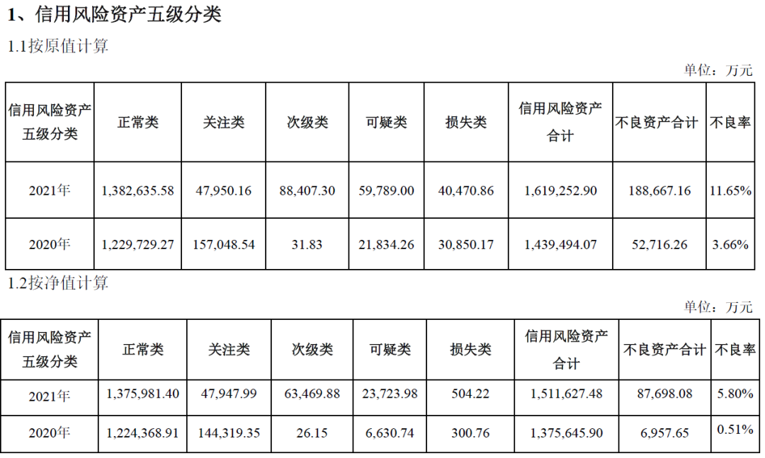 2.在信用風(fēng)險資產(chǎn)的五級分類中,陜國投報告期內(nèi)的不良資產(chǎn)合計18.86億元,不良率為11.65%,去年的這一數(shù)據(jù)為5.27億元和3.66%。上述數(shù)據(jù)是按原值計算,如果按照凈值計算,2021年不良資產(chǎn)為8.77億元,不良率為5.80%;2020年這一數(shù)據(jù)僅為0.70億元和0.51%。