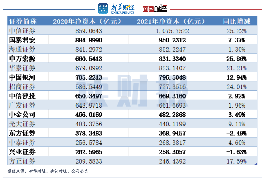 在以凈資本為核心的監管體系中,2021年多家券商通過股權融資補血,使得凈資本總規模顯著擴張。在已披露2021年年報的上市券商中,中信證券的年末凈資本超過千億元,國泰君安的年末凈資本超過900億元。