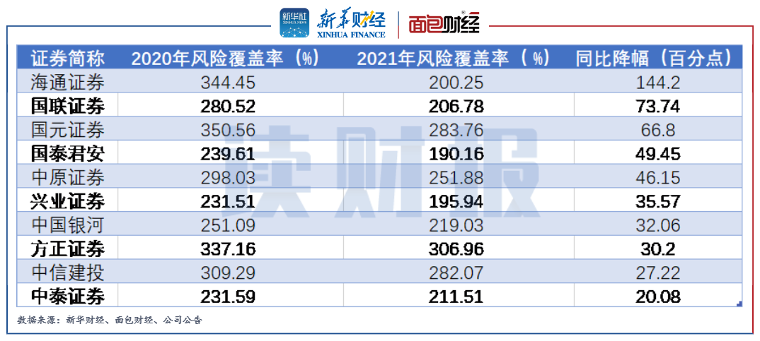 圖9:2021年風險覆蓋率同比降幅較大的前十家上市券商