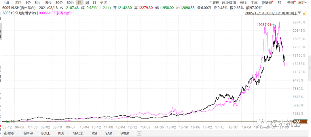 圖1、貴州茅臺(黑色)和長春高新(粉色)復(fù)權(quán)后股價走勢