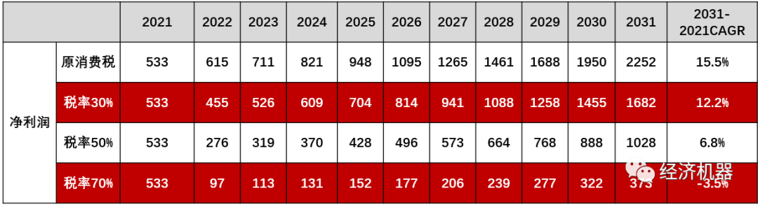 消費稅率在50%的較極端情景下,考慮出廠價大幅漲價(年化10%),未來十年CAGR增速降至6.8%。顯然是無法支持當(dāng)前40多倍的高估值的。
