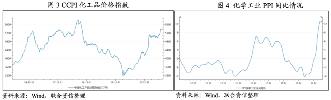 2021年上半年,隨著全球范圍疫情控制及恢復生產,對化工品需求的增加支撐了化工品價格上漲。截至2021年6月底,化工產品價格指數(CCPI)達到5100點附近,處于近年相對高位。同期,化學工業PPI同比大幅增長,超過2017和2018年的最大同比增幅。