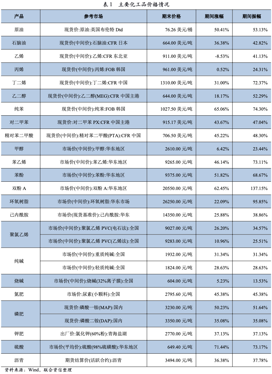 2021年上半年,主要廠商裝置檢修使得部分化工品階段性供需錯配,對局部區域內化工品市場價格影響顯著,相關化工品表現活躍,產品價格大幅波動,但原油價格上漲對下游化工品形成有力支撐,期末多數化工品價格有不同程度上漲。