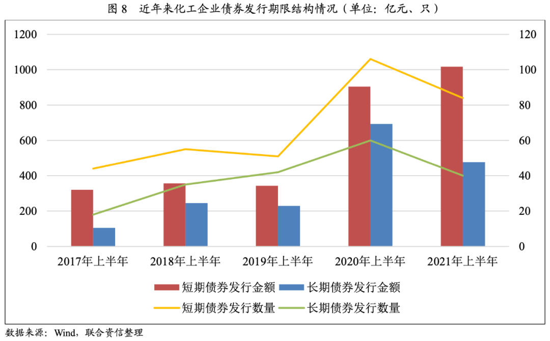 從發行品種來看,2021年上半年,化工企業發行信用債券中,超短期融資券同比減少18只,但仍為第一大品種,共計發行78只,占62.90%。公司債券發行量居第二位,共計發行28只,同比增加5只,占22.58%。其余為中期票據和短期融資券,分別發行12只和6只。2017年以來,超短期融資券均為化工行業上半年債券發行的第一大品種,且2021年占比達近年來高位;公司債券發行量近年來逐年增長,2021年上半年發行量占比首次超過20%。