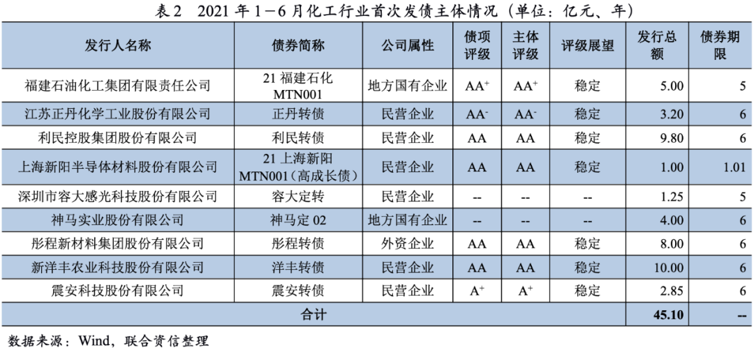 2021年上半年,化工行業首次發債主體以民營企業為主,可轉債為信用等級相對較低的企業拓寬了債券市場融資渠道。