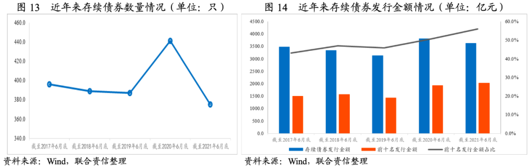 截至2021年6月底,化工行業存續債券數量375只,存續債券余額3627億元,從近五年情況來看,存續債券余額為近年來同期高位,僅次于2020年,但同期存續債券數量為近五年最低數值,平均單只債券規模為歷史同期峰值。此外,化工行業前十名發行金額及占總發行金額比例整體呈上升趨勢,截至2021年6月底,化工行業前十名發行金額達2034億元,占總發行金額的56.07%,發行主體集中度愈發提高,中小企業的信用債市場的發行難度在加大,存續規模居前的化工企業有中國石油化工股份有限公司(540.00億元)、中國化工集團有限公司(420.00億元)和中國藍星(集團)股份有限公司(205.00億元),恒力集團有限公司(175.00億元)、浙江恒逸集團有限公司(135.00億元)、浙江榮盛控股集團有限公司(117.00億元)、桐昆集團股份有限公司(67.00億元)、煙臺國豐投資控股集團有限公司(120.00億元)、萬華化學集團股份有限公司(79.80億元),主要為融資能力和融資需求較高的大型央企集團、大型煉化企業及大型化工新材料公司。