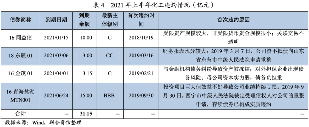 2021年上半年,化工行業無新增違約主體。新增到期違約債券主要系前期已違約主體無償付能力所致。2021年上半年,化工行業違約債券合計金額31.15億元,占上半年到期化工債券總額的3.04%,占六月末存續債券余額的0.87%,整體風險可控。