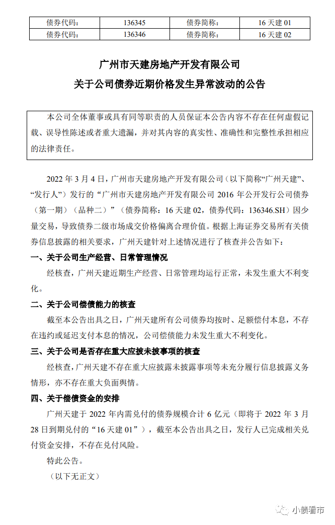 此外,截至本公告出具之日,廣州天建所有公司債券均按時、足額償付本息,不存在違約或延遲支付本息的情況,公司償債能力未發生重大不利變化。