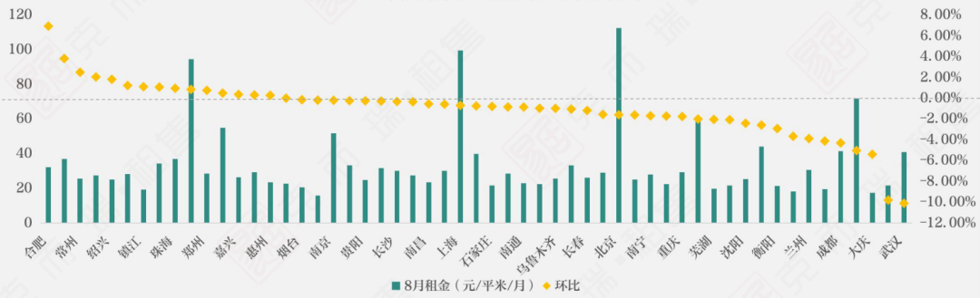 集中式公寓方面,重點八城中深圳、成都兩城租金整體下跌較為顯著,其他城市基本較上月持平。分散式公寓方面,成都受此前大規(guī)模品牌爆雷影響,市場對分散式公寓整治行動逐步開始,在此前連續(xù)下跌后本月出現(xiàn)回升。其中,國家發(fā)布通知,統(tǒng)籌解決新市民、低收入困難群眾等重點群體租賃住房問題,住房租金年度漲幅不超過5%,對各城市租金下跌影響較大。