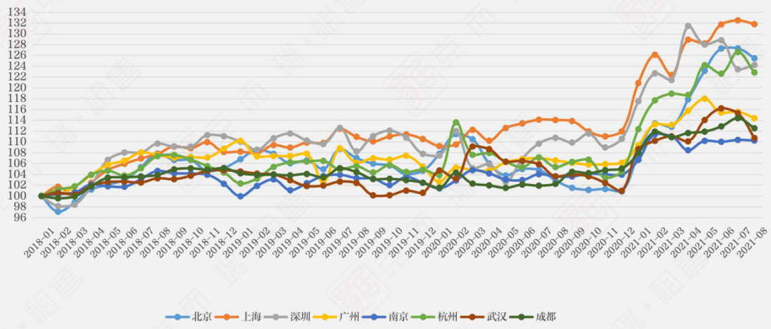 分城市來看,我們以2018年1月為基期,核心8城租賃價格指數(shù)出現(xiàn)下降。截至2021年8月,8城市租賃價格指數(shù)區(qū)間仍然位于97.09-132.5,城市間差異較大;上海租賃市場的發(fā)展的持續(xù)性和穩(wěn)定性最好。廣州租賃市場近期表現(xiàn)較差,跌出第一梯隊。