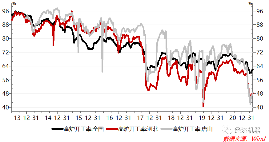 3)環(huán)保風暴。金山銀山不如綠水青山。建設綠色中國,是地方政府考核的硬杠杠和“高壓線”。一旦環(huán)保排名倒數(shù),輕則主要負責人誡勉談話,重則下臺負責。相反,新時代淡化了對經(jīng)濟增速的要求,不追求高增長成為一種“共識”。在環(huán)保硬約束、增長有彈性的情況下,各級地方政府將“環(huán)保”置于“增長”之上,環(huán)保限產(chǎn)始終處于高壓狀態(tài)。比如,3月19日,唐山發(fā)布鋼企限產(chǎn)最新措施,全市全流程鋼鐵企業(yè)3月20日至12月31日減排比例達到30%-50%。目前河北和唐山高爐開工率僅有48%,遠低于全國62%的水平(圖6)。