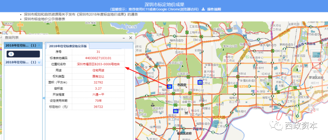 2. 標(biāo)準(zhǔn)宗地:在按用途劃分的標(biāo)定區(qū)域內(nèi),有且只有一塊代表該標(biāo)定區(qū)域內(nèi)該用途的標(biāo)準(zhǔn)地塊,即標(biāo)準(zhǔn)宗地。以深圳市政府所處住宅用途標(biāo)定區(qū)域為例(藍(lán)色方塊即是標(biāo)準(zhǔn)宗地)。