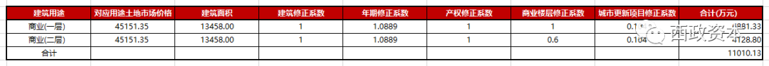 (5)商業(yè)用途項目修正系數(shù)=∑(各“用地類別或改造類型”面積占比×對應(yīng)修正因子)=80.5%×0.081+19.5%×0.2=0.065+0.039=0.104