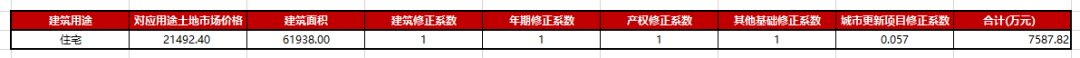 住宅地價=住宅用途土地的市場價格X建筑面積X建筑類型系數(shù)X年期系數(shù)X產(chǎn)權(quán)修正系數(shù)X城市更新項目修正系數(shù)=21492.4×(70334-8396) ×1×1×1×0.057=7587.82(萬元)