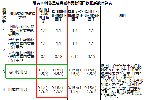 (2)計算住宅用途地價在城中村用地類型下的修正因子:0.1×(1-4.5/8.13)=0.1×(1-0.55)=0.045 ,住宅用途地價在歷史用地處置類型下的修正因子則通過查詢城市更新項目修正系數(shù)表直接按0.11確定。