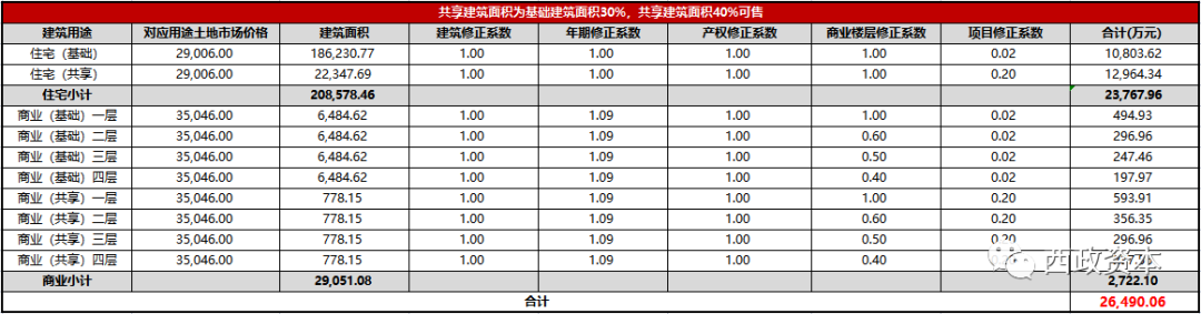 宗地地價=∑(土地市場價格×對應(yīng)建筑面積×基礎(chǔ)修正系數(shù)×項目修正系數(shù))=住宅地價+商業(yè)地價=7587.82+11010.13=18597.95(萬元)=約合1.86(億元)。