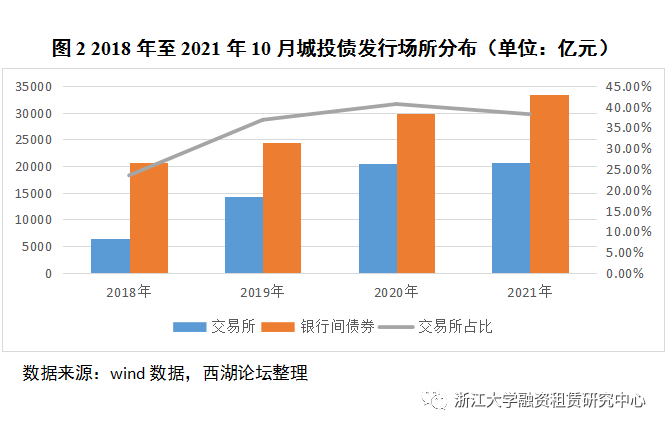 在城投債發行場所方面,2021年以來,在城投債發行量整體上升的情況下,交易所發行量占比呈現下降趨勢,說明“紅橙黃綠”政策的出臺,以及交易所、交易商協會相應政策調整,對交易所城投債的發行起到了一定的限制作用。