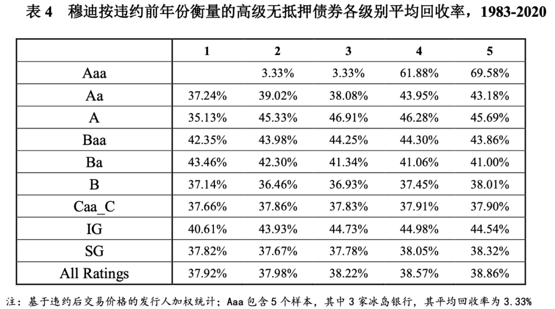 根據(jù)穆迪公開資料顯示,平均違約回收率是指特定信用級(jí)別的債務(wù)工具多年期平均違約回收水平。以2020年度報(bào)告為例,表4列出高級(jí)無抵押債券在違約前一年至前五年對應(yīng)的信用級(jí)別的平均回收率,違約前2年為B級(jí)別的平均回收率為36.46%,是指違約兩年前為B級(jí)的高級(jí)無抵押債券在兩年內(nèi)一定時(shí)間的平均回收率水平為36.46%。