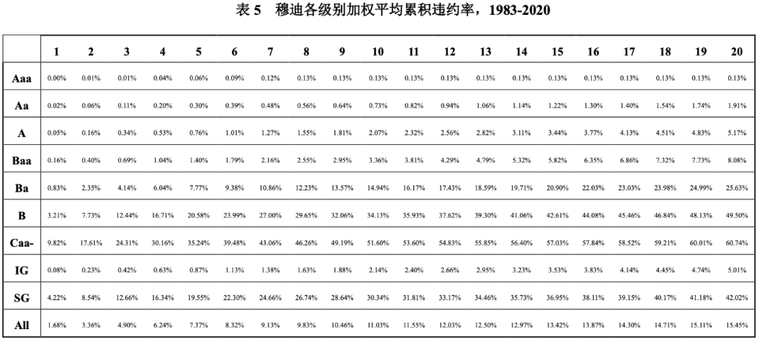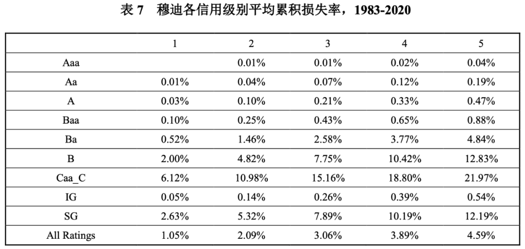 違約損失率信息披露方面,穆迪在其年度違約和回收率報(bào)告的附件中,列示了從1983年至當(dāng)年的平均累積信用損失率,以2020年度報(bào)告為例,根據(jù)表5和表6的數(shù)據(jù)得出表7中平均累積損失率的數(shù)據(jù)。