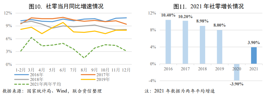 多點散發(fā)疫情對消費沖擊較大。2021年我國社會消費品零售總額(以下簡稱“社零”)44.08萬億元,同比增速12.50%,兩年平均增速3.98%,與疫情前水平差距仍然較大。疫情前2019年消費的月度增速大概在7%左右的水平,而2021年消費兩年平均增速則基本維持在4%~5%的區(qū)間,8月是全年的低點,僅為1.50%,消費仍有較大的恢復(fù)空間。消費疲弱的短期影響因素主要有疫情多點發(fā)生、居民消費與出行活動的減少,而疫情以來一直表現(xiàn)較好的網(wǎng)上實物商品銷售兩年平均增速在2021年下半年連續(xù)出現(xiàn)下滑,從7月的16.65%持續(xù)下行至12月的13.39%,或反映出消費疲弱不僅是由于短期疫情因素的沖擊。
