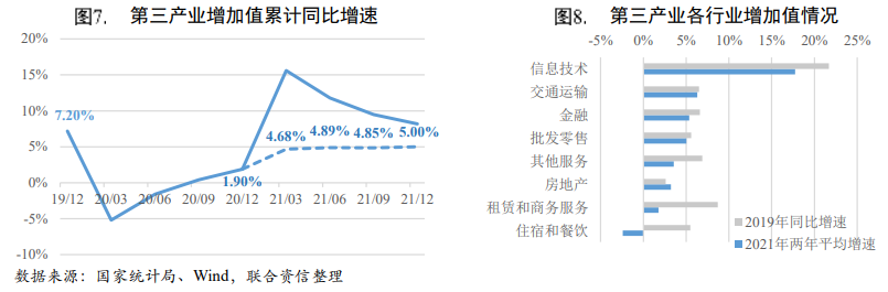 三大產(chǎn)業(yè)方面,2021年第一、二產(chǎn)業(yè)增加值兩年平均增速均高于疫情前2019年的水平,恢復(fù)情況良好;而第三產(chǎn)業(yè)增加值兩年平均增速仍未回到疫情前水平,主要是服務(wù)業(yè)受局部疫情反復(fù)影響較大。