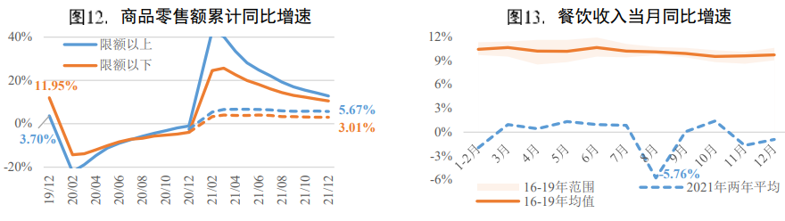 限額以下商品零售和接觸性服務(wù)仍是消費的主要拖累。2021年商品零售額同比增長11.80%,兩年平均增長4.51%,不及疫情前水平(2019年為7.90%)。商品零售與疫情前差距主要體現(xiàn)在限額以下的部分:2021年限額以下商品零售額兩年平均增速僅為3.01%,與疫情前2019年的增速水平(11.95%)相差較大。限額以上商品零售額兩年平均增速均為正值,汽車銷售上半年表現(xiàn)強勢,而自二季度以來受芯片供應(yīng)短缺以及排放標(biāo)準(zhǔn)升級切換期等影響較大,汽車零售額兩年平均增速多次落入負值區(qū)間。餐飲收入受疫情沖擊較大,2021年餐飲收入同比增長18.60%,兩年平均下降0.55%,餐飲消費規(guī)模仍不及疫情前水平。餐飲收入等接觸性消費由于對疫情變化更為敏感,整體波動較大且較疫情前水平差距較大,仍有較大的恢復(fù)空間。