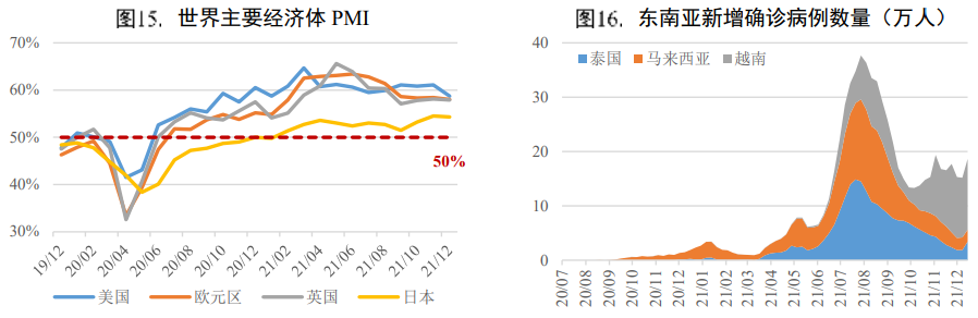 海外產(chǎn)需缺口、出口替代效應(yīng)以及低基數(shù)等因素支撐我國出口高增長。2021年主要經(jīng)濟體PMI高位運行,全球經(jīng)濟持續(xù)恢復(fù),海外需求旺盛但產(chǎn)需依然存在較大缺口,加之東南亞疫情反復(fù)導(dǎo)致的出口替代作用,共同支撐我國出口維持高景氣度。但海運領(lǐng)域出現(xiàn)的集裝箱運力緊張、運價高漲問題對出口產(chǎn)生了一定的負面影響。三季度以來出口價格上漲對出口金額的貢獻度上升,集成電路、手機和家用電器等受大宗商品漲價明顯的行業(yè),出口均表現(xiàn)出量減價增的特點。從主要出口產(chǎn)品對整體出口同比增速的拉動來看,自動數(shù)據(jù)處理設(shè)備及其零部件、集成電路依然是出口的最大拉動項;紡織紗線、織物及制品由于上年基數(shù)較高,對出口造成負向拉動。