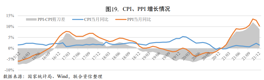 PPI-CPI剪刀差大幅擴大。2021年1-10月,PPI與CPI剪刀差持續(xù)擴大,成本上漲難以轉(zhuǎn)嫁,中下游企業(yè)利潤承壓。隨著年底PPI漲幅有所回落,PPI-CPI剪刀差小幅收窄,上游生產(chǎn)價格繼續(xù)上升動能減弱,價格加快向下游行業(yè)傳導(dǎo),中下游企業(yè)的成本壓力或?qū)⒌玫揭欢ǔ潭鹊木徑狻?br/>