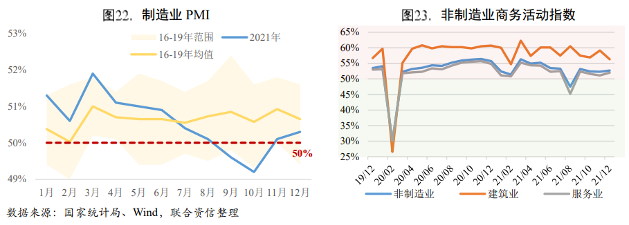 2021年,我國制造業(yè)PMI除9、10月外均位于榮枯線上,整體呈現(xiàn)出上半年景氣度較高、下半年景氣度較低的態(tài)勢。上半年制造業(yè)PMI波動在51%左右的水平,高于2016-2019年同期的均值,上半年制造業(yè)景氣度較高;而下半年制造業(yè)PMI則在榮枯線上下波動,回落至低于2016-2019年同期的均值的區(qū)間,下半年制造業(yè)景氣度有所回落。分企業(yè)類型來看,小型企業(yè)生產(chǎn)經(jīng)營面臨的壓力仍然較大,景氣水平偏弱。12月,制造業(yè)PMI回升0.20個百分點至50.30%,延續(xù)小幅回升態(tài)勢。