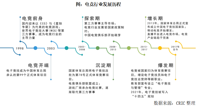 1998年,《CS》、《星際爭霸》等為代表的電競游戲風靡全國,我國初露電競萌芽。2003年,中國體育總局承認電子競技為我國正式開展的第99個運動項目,標志著國內(nèi)電競的開端。從2003年到2017年期間,電競行業(yè)經(jīng)歷了探索期、沉淀期、增長期,逐步從國家政策制約轉變?yōu)閲抑С郑a(chǎn)業(yè)鏈趨于完善;2017年,電競正式被國家歸為體育競賽項目,并增設電競相關專業(yè)與職業(yè);2021年,電競入亞、《英雄聯(lián)盟》總決賽奪冠,電子競技產(chǎn)業(yè)的社會影響持續(xù)擴大,電競被寫入“十四五”規(guī)劃,走向標準化,迎來快速增長時期。
