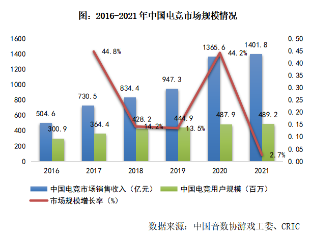 2016-2021年間,中國電競行業(yè)迅速發(fā)展,市場規(guī)模平均復合增長率達22.7%;截至2021年年末,中國電競行業(yè)銷售規(guī)模達1401.8億元。其中,2020年因疫情居家隔離政策,增加了電競游戲時間,電競用戶同比增長9.6%至約4.88億人,市場銷售收入同比增長44.2%;2021年受疫情持續(xù)反復影響,電競重要線下賽事減少,線上模式商業(yè)變現(xiàn)受阻,同時受制于未成年人網(wǎng)絡游戲防沉迷等相關政策要求,中國電競規(guī)模增速放緩,銷售收入同比增長率僅2.7%。