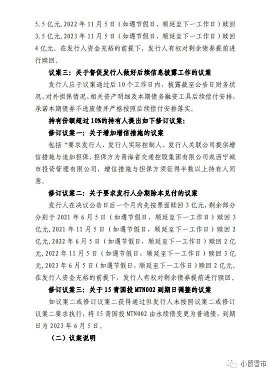 11月5日,青海省國有資產投資管理有限公司(以下簡稱“青海國投”)“15青國投MTN002”主承銷興業銀行公告稱,持有人會議中持有份額超過10%的持有人提出如下修訂議案:增加增信措施、要求發行人分期除本兌付以及關于“15青國投MTN002”到期日調整等。