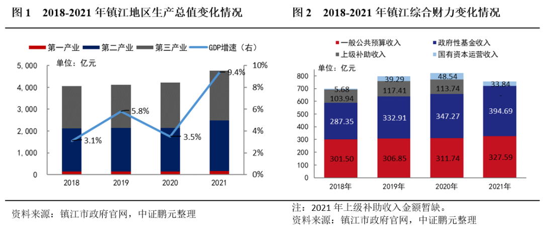 而鎮江地處強市如云的蘇南地區,經濟總量和增長動力和其他四市比存在較大差距,是名副其實的經濟“洼地”。2018年-2020年,鎮江市地區生產總值一直增長乏力,但2021年恢復情況較好,GDP增速升至9.4%,高于江蘇省GDP增速8.6%,在省內各地級市中排名前三。綜合財力方面,2021年鎮江市一般公共預算收入及政府性基金收入增速均明顯提升,尤其政府性基金收入大幅增加47.42億元,而一般公共預算收入中稅收收入占比約75%-80%,土地財政向好及稅收增長對綜合財力的貢獻作用較大;但財政自給率由2018年的74%下滑至2021年的60%,財政自給能力逐年弱化。