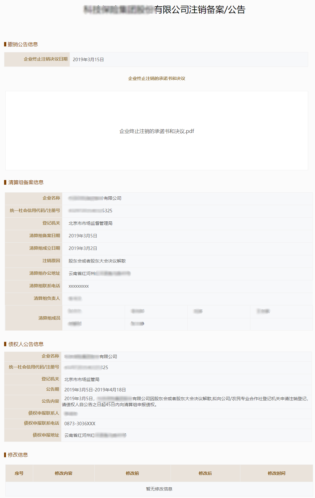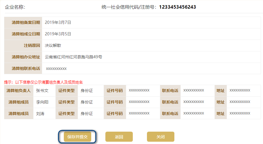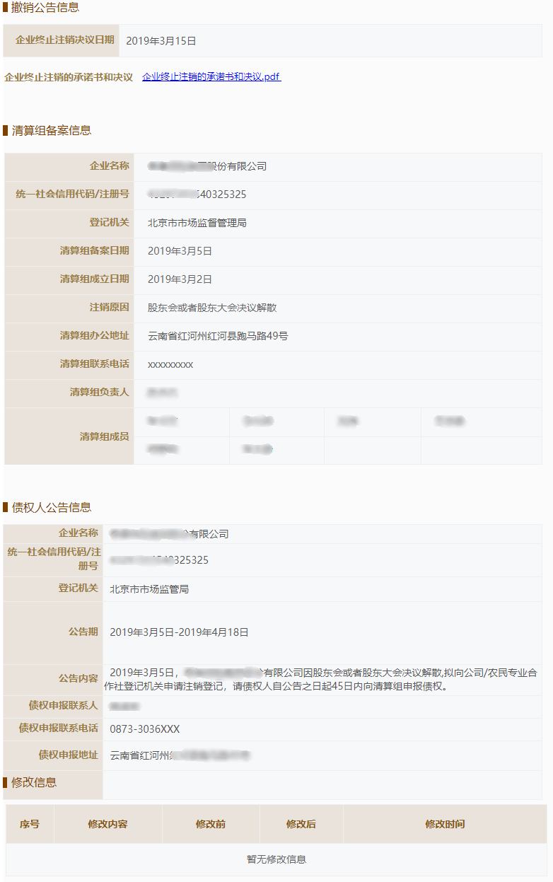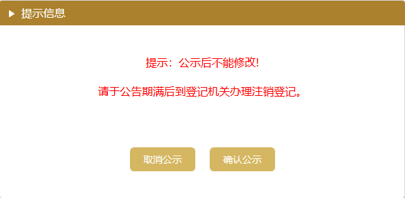 5.3撤銷了清算組備案和債權人公告的,提示“該企業已撤銷清算組備案(債權人公告)。”該提示信息會保留45天,45天后自動取消。