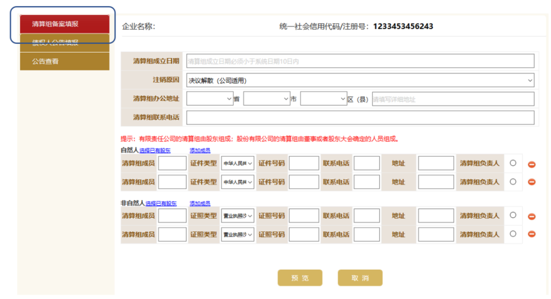 1.4通過“清算組備案填報”,錄入清算組成員信息