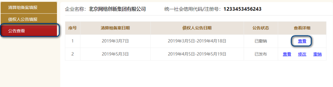 4.4通過“公告查看”,可以看到債權人公告相關信息