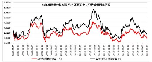 雖然10年期國(guó)債收益率在近期內(nèi)盤中多次破“3”,但收盤價(jià)卻始終在3%以上。2019年8月13日,10年期國(guó)債收益率自7月29日連續(xù)下行18個(gè)BP至3.0041%的水平,不到半個(gè)月下行了近20個(gè)BP,這也是最接近3%的一次。