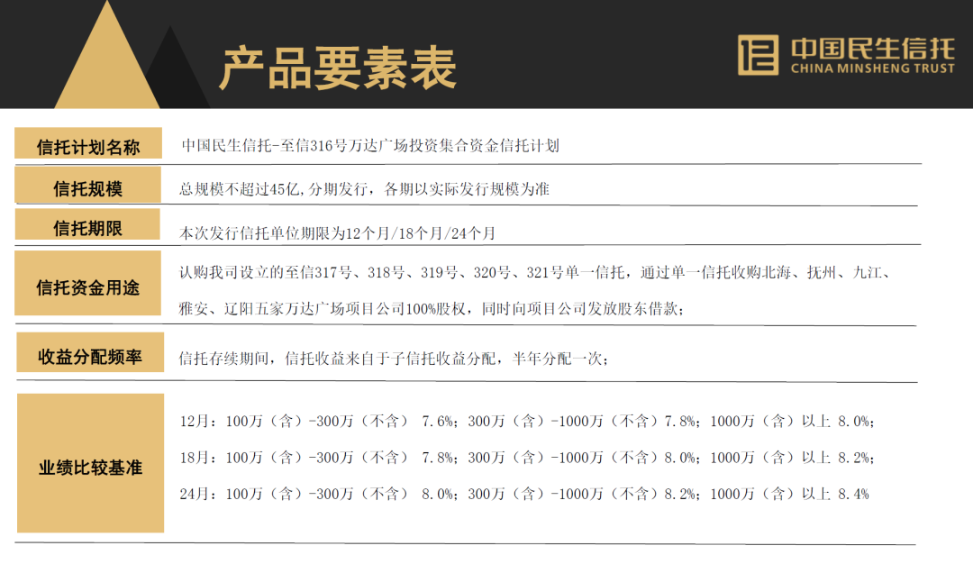 在產品推介要素表當中,強調了該信托計劃的資金用于設立單一信托,收購北海、撫州、九江、雅安和遼陽五家萬達廣場項目公司100%的股權,同時向項目公司發放股東借款。