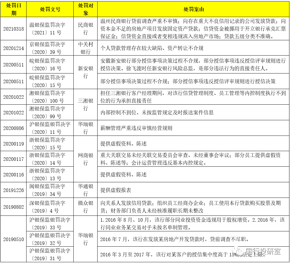 這15張罰單主要針對華瑞銀行(4張罰單)、網商銀行(3張罰單)、新安銀行(2張)、三湘銀行(2張)、民商銀行1張、中關村銀行1張、華通銀行1張、微眾銀行1張,從處罰案由來看,主要包括提供虛假資料和虛假報表、貸前調查不審慎、授信事項決策過程不合規、關聯交易、房地產貸款等等。