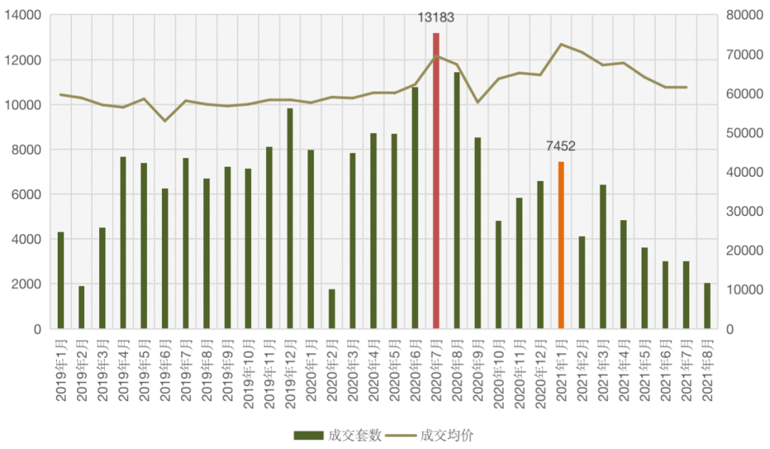 圖:2019年1月-2021年8月上海二手住宅成交量價走勢(單位:套,元/平方米)