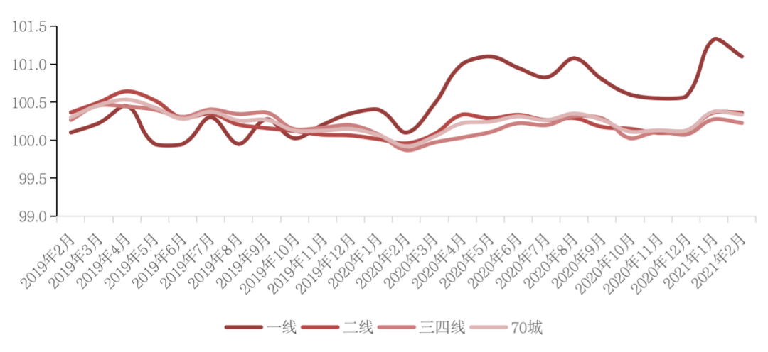圖:2019年2月-2021年2月70城及各能級城市新建商品住宅價格指數環比走勢
