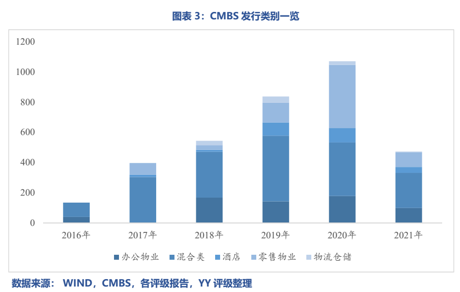 CMBS(商業(yè)地產(chǎn)抵押貸款支持證券)的特征為以商業(yè)地產(chǎn)為抵押、以相關(guān)商業(yè)地產(chǎn)未來(lái)收入(如租金、物業(yè)費(fèi)等)為償還本息來(lái)源的資產(chǎn)支持證券產(chǎn)品。其中,商業(yè)地產(chǎn)往往包括一個(gè)或多個(gè)商場(chǎng)、寫字樓、酒店、公寓等商業(yè)地產(chǎn)的抵押貸款組合。而抵押貸款支持證券意味著相比REITS并不出表,往往通過(guò)信托計(jì)劃+專項(xiàng)計(jì)劃的雙SPV結(jié)構(gòu)發(fā)行。另外,銀行間市場(chǎng)發(fā)行的稱為CMBN,現(xiàn)與CMBS大致類似,一般分類為CMBS/CMBN,下文統(tǒng)稱為CMBS。