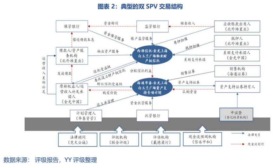 典型的雙SPV交易結(jié)構(gòu)如下圖金光白玉蘭CMBS所示,雙SPV交易結(jié)構(gòu)也是目前我國(guó)絕大多數(shù)CMBS的交易結(jié)構(gòu):