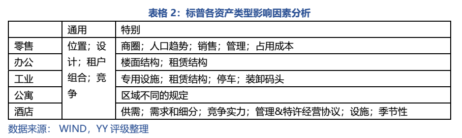 現(xiàn)金流分析是標(biāo)普CMBS交易評(píng)級(jí)的起點(diǎn)。通常而言,標(biāo)普將全球CMBS交易分為五種主要類型:零售、辦公、工業(yè)、公寓和酒店,并劃分了幾種資產(chǎn)類型通用的以及不同的對(duì)現(xiàn)金流的影響因素,如表2所示。