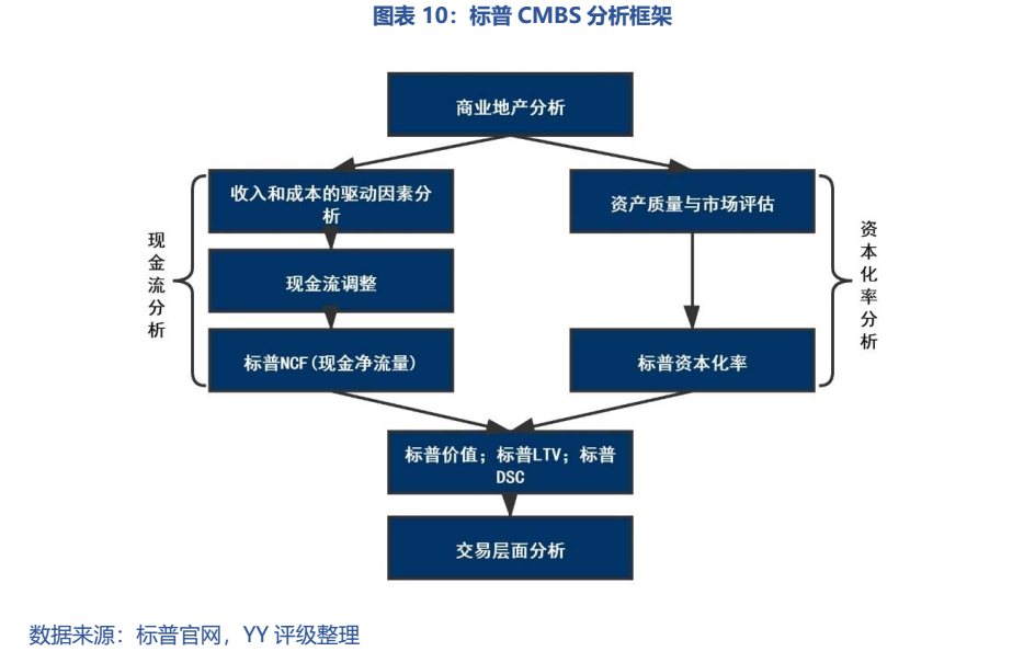 具體操作而言,標(biāo)普CMBS評(píng)級(jí)分為三個(gè)主要部分:資產(chǎn)現(xiàn)金流量分析、資本化率估計(jì)及其在估計(jì)資產(chǎn)價(jià)值中的用途、以及與資產(chǎn)分析相關(guān)的分析指標(biāo)和其他考慮因素。大致的流程如圖12所示,標(biāo)普會(huì)先通過(guò)收入和成本的驅(qū)動(dòng)因素分析+對(duì)特殊或與市場(chǎng)情況有一定距離的情況進(jìn)行調(diào)整以得到預(yù)期現(xiàn)金流,再通過(guò)資產(chǎn)質(zhì)量與市場(chǎng)評(píng)估得到資本化率的估計(jì),進(jìn)而得到1)標(biāo)普價(jià)值=標(biāo)普NCF/標(biāo)普資本化率;2)標(biāo)普DSC=標(biāo)普NCF/本息支付;3)標(biāo)普LTV=貸款余額/標(biāo)普價(jià)值。以上三個(gè)指標(biāo)再在交易層面結(jié)合壓力測(cè)試和資產(chǎn)多樣性指標(biāo),以確定每個(gè)不同法律、環(huán)境背景下的區(qū)域的不同CMBS交易的信用風(fēng)險(xiǎn)和最終增信級(jí)別。