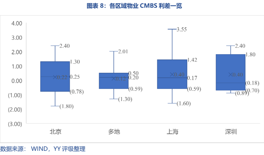 我們以A1優(yōu)先級(jí)的CMBS與主體信用利差為例,不同資產(chǎn)類型和不同城市的利差皆有不同。其中辦公物業(yè)、混合類、酒店、零售物業(yè)、物流倉(cāng)儲(chǔ)的平均利差約為36、14、45、7、22 bp;而我們只看重點(diǎn)城市北京、上海、深圳的話(多地為多地多個(gè)資產(chǎn),平均12 bp)平均利差約為22、40、40bp。綜合而言,從利差角度,市場(chǎng)對(duì)核心城市(北上深)的辦公物業(yè)、酒店、物流倉(cāng)儲(chǔ)資產(chǎn)認(rèn)可程度較好,高于總體平均利差,而混合類和零售物業(yè)類資產(chǎn)雖然占比很高但方差也較大。