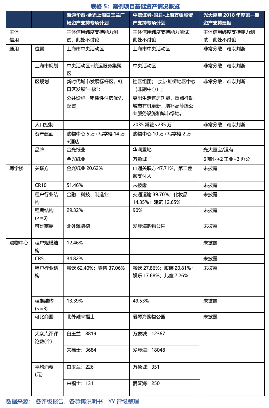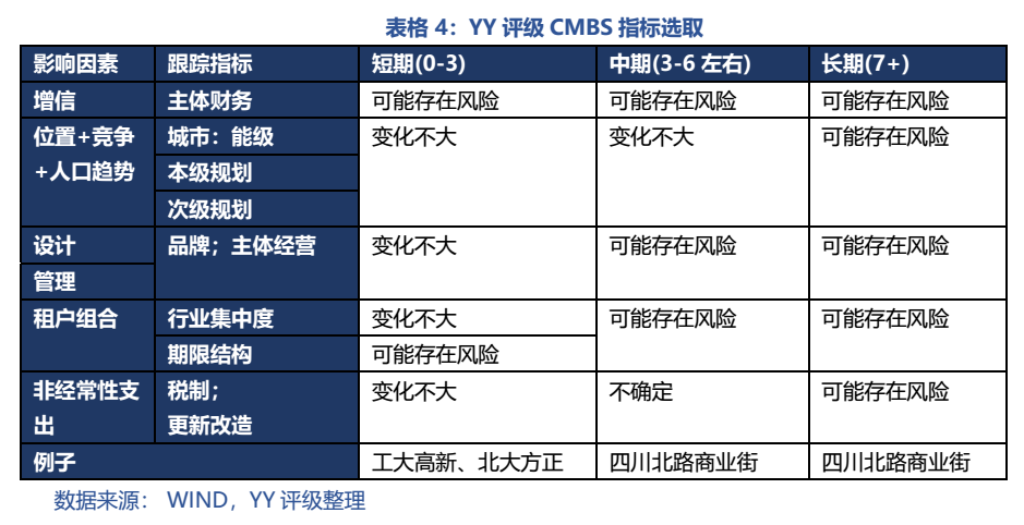 概括而言,表4的指標(biāo)設(shè)計(jì)成維度定性跟蹤指標(biāo),即主體財(cái)務(wù)以反映增信風(fēng)險(xiǎn)、主體經(jīng)營(yíng)(品牌)以反映設(shè)計(jì)和管理風(fēng)險(xiǎn)、各級(jí)城市規(guī)劃也反映位置+競(jìng)爭(zhēng)+人口趨勢(shì)問(wèn)題以及用行業(yè)分布、期限結(jié)構(gòu)來(lái)跟蹤租戶組合風(fēng)險(xiǎn),同時(shí)關(guān)注一些可能的非經(jīng)常性支出問(wèn)題,如稅制改革(房地產(chǎn)稅)和更新改造需求(五角場(chǎng)萬(wàn)達(dá)為10年左右后改造)。