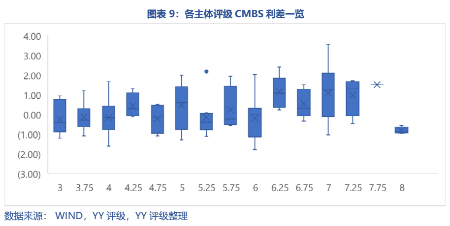 3)整體而言從利差角度認(rèn)可“商業(yè)地產(chǎn)抵押”的增信效果,尤其是對(duì)弱主體增信效果明顯。