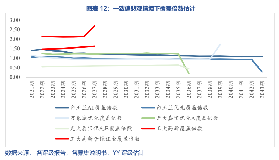 如圖14可見(jiàn),在租金和出租率都偏悲觀(樂(lè)觀不消說(shuō)除最后一期外都是足額的)的情況下,白玉蘭對(duì)A1級(jí)本息覆蓋倍數(shù)也一直保持在1以上,2027年開(kāi)始對(duì)優(yōu)先A2級(jí)利息覆蓋不足,但也在0.95以上,但無(wú)法保障A2級(jí)本金償還;萬(wàn)象城只有一層優(yōu)先級(jí),悲觀預(yù)期下2024年開(kāi)始優(yōu)先級(jí)本息覆蓋倍數(shù)小于1,但也一直處于0.9以上;光大嘉寶對(duì)優(yōu)先A級(jí)保障程度較好,但對(duì)優(yōu)先B級(jí)幾乎肯定無(wú)法覆蓋本息,必然依賴主體信用;工大高新在考慮不考慮保證金的情況下覆蓋倍數(shù)都較好,考慮保證金的情況下覆蓋倍數(shù)更是達(dá)到了2左右。