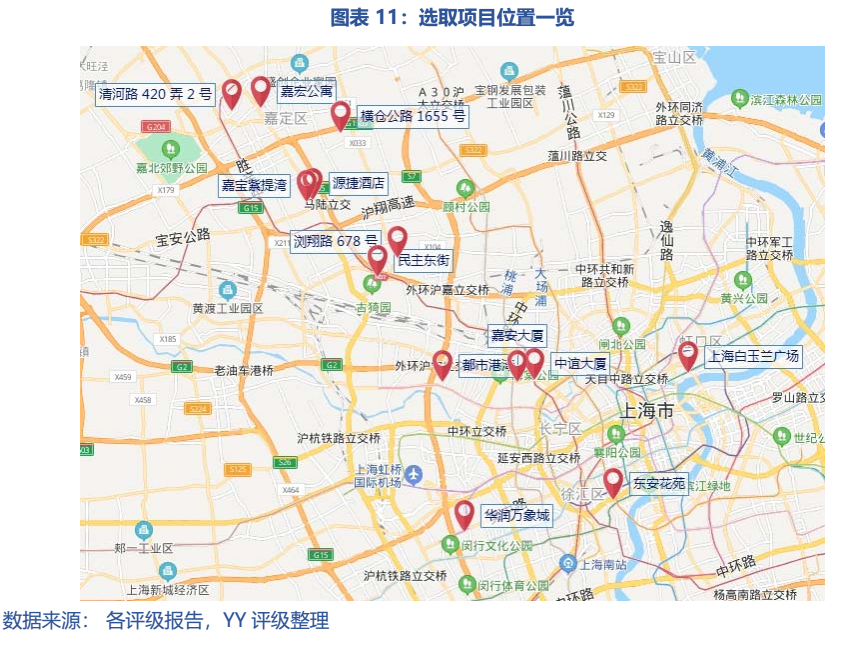除光大嘉寶外,華潤(rùn)萬(wàn)象城、金光白云蘭均為中央活動(dòng)區(qū)(外環(huán)內(nèi))單一地點(diǎn)的辦公、零售混合類物業(yè),而光大嘉寶的資產(chǎn)池包含了6個(gè)零售物業(yè)、3個(gè)辦公物業(yè)和2個(gè)工業(yè)物業(yè),且位置分散,基本都處于外環(huán)外。